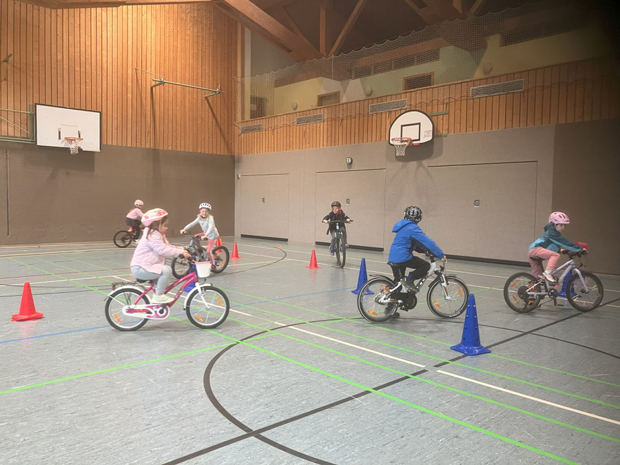 Zu Beginn des Schuljahres wird jedes Jahr die Turnhalle in einen Fahrrad-Parcours umgebaut. Jedes Kind bringt sein eigenes Fahrrad mit